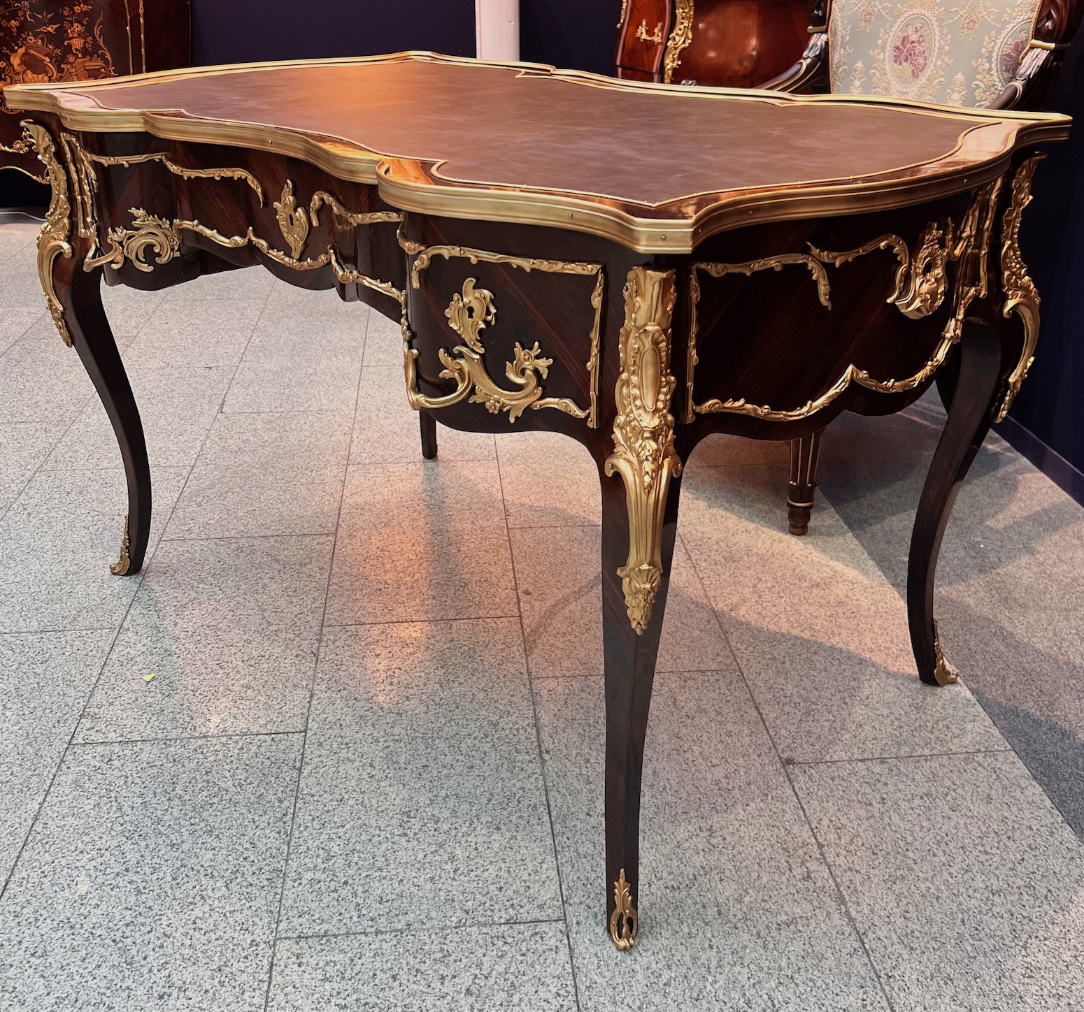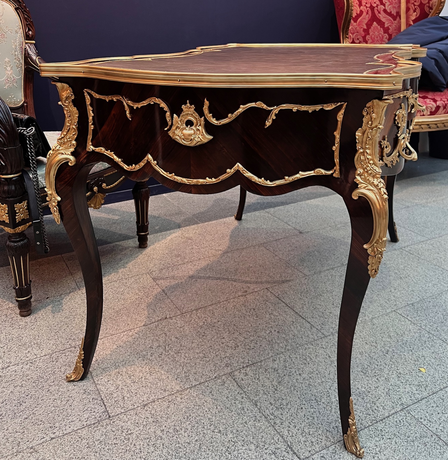 Массив ореха, королевское дерево (шпон), резьба, бронза, литье, чеканка, золочение, кожа. Высота 76,5 длина 116 ширина 80. Франция, вторая половина XIX века. Состояние после реставрации